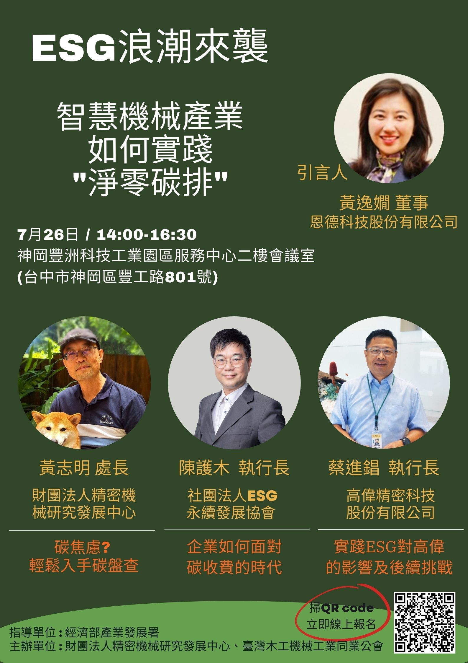 7月26日【ESG浪潮來襲:智慧機械產業如何實踐淨零碳排】分享會,邀請您報名參加。